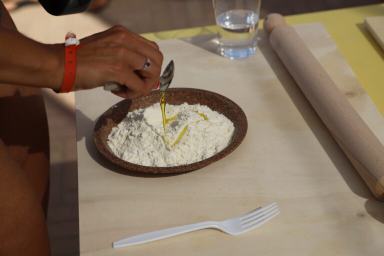 There is a different scent in the air today on Altamarea’s square. A scent that feels like home, like fresh tomatoes, olive oil and tradition. Annalisa, known as “Tu Chef” on social media, arrives with her arms full of fresh ingredients to lead two cooking labs. Two workshops, one for children and one for adults, sharing the same spirit: doing things together, getting your hands dirty, and letting the land tell its own story, one dish at a time. With expert hands and a smiling voice, Annalisa, who comes from Imola, explains: “I always try to bring together my passion for cooking and the products of my region: whether it’s mortadella, squacquerone, or homemade pasta: passatelli, strozzapreti or garganelli, which actually comes from Imola!”