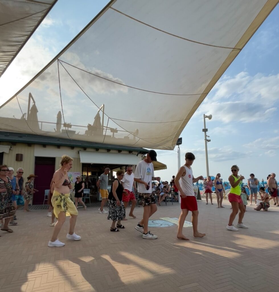 Un attroupement de nombreux enfants se créé sur la petite place : Francesco, animateur et danseur du jour monte sur scène sur la mélodie de baby shark et c’est parti pour une demi-heure de spectacle pour des parents ravis qui filment fièrement un début de carrière de danseur prometteur pour tous ces bambins. Certains parents accompagnent les enfants et, le temps d’un instant, apprécient pleinement ce court retour en enfance. Bras vers le haut, puis vers le bas, on tourne, on tape dans les mains et bien sûr on jette un oeil aux parents pour vérifier qu’ils nous regardent encore !