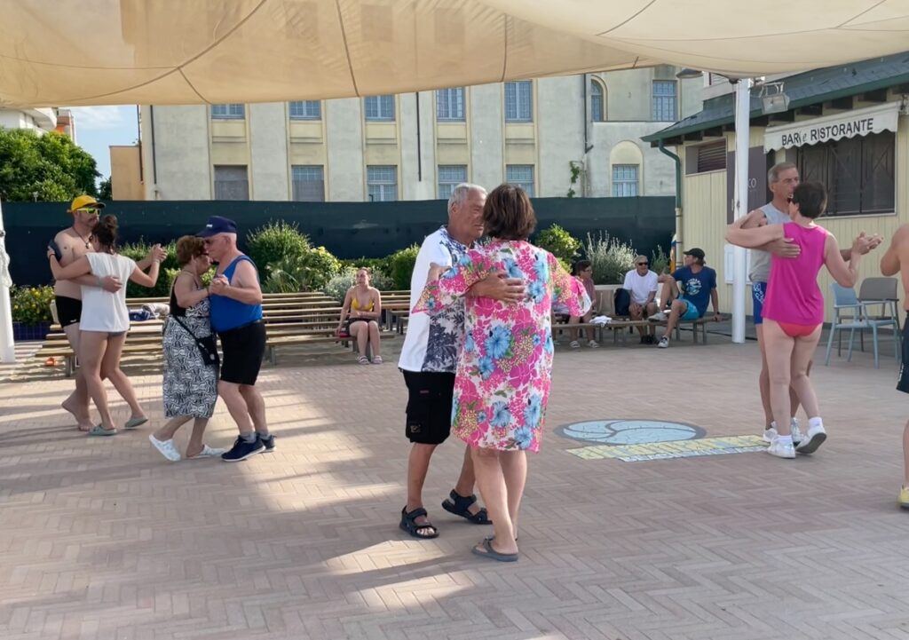 Le monde arrive sur la petite place, la musique attire les habitués mais pas seulement ! Les curieux qui marchaient le long de la passeggiata del ponente s’arrêtent pour profiter du spectacle, et certains se déhancent avant de continuer leur promenade. Le soleil tape encore de ses brillants rayons et donne petit à petit une coloration orangée à la fin d’après-midi. Les nombreux spritz a moitié bus sur les tables du bar indiquent bien que le moment de l’apero est arrivé.