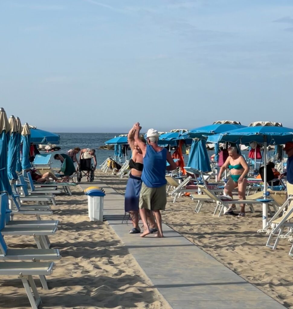L’après-midi bat son plein à l’Altamarea, les transats sont remplis, les vacanciers se reposent, lisent, scrollent sur leur téléphone. Les enfants jouent, courent et parfois rendent fous leurs parents. Au terrain de bocce, c’est la folie : j’assiste à une partie endiablée. Le public est exalté, les joueurs concentrés, les commentaires sur le lancé des uns et des autres fusent et des rires joyeux s’ensuivent. Soudain, le Toum Toum Toum Toum reconnaissable de l’Altamarea retentit du haut-parleur. “Popolo dell’Altamarea !” annonce Alessandro avec un grand sourire. Depuis son petit gazebo, le chef animateur liste les rendez-vous de l’après-midi et laisse la musique s’emparer du lieu. L’Altamarea se réveille alors de sa douce sieste méridionale.
