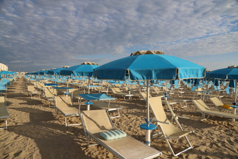 Il est presque sept heures, et toute l’équipe de l’Altamarea est déjà à l’œuvre. Ce matin, le ciel est un peu nuageux, mais les couleurs de l’aube nous offrent déjà un spectacle éblouissant de lumières et de nuances. Une légère brise caresse la plage encore déserte. Les vacanciers dorment encore, probablement fatigués de la nuit de danse de la veille. Mais les maîtres-nageurs sont déjà au travail. Un café rapide au bar pour se donner de l’énergie, et sous mes yeux émerveillés commence une chorégraphie parfaitement orchestrée. Chacun sait quoi faire. Chacun rejoint sa ligne, et le clic des parasols qui s’ouvrent résonne comme une douce musique du réveil. L’un après l’autre : clic, clic, clic. Peu à peu, l’Altamarea se couvre d’un grand voile bleu.