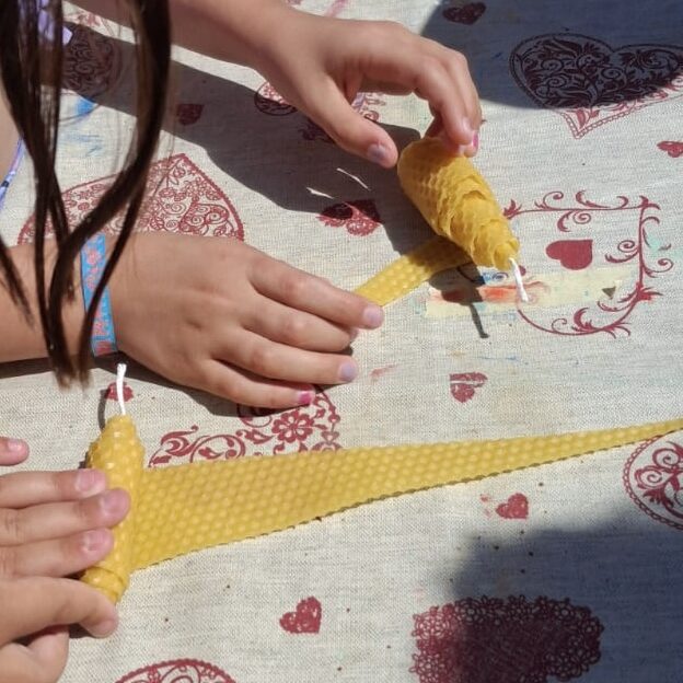 Les abeilles dont elle parle ne sont pas que des insectes : elles deviennent des symboles de coopération, de gentillesse, de nature qui travaille en harmonie. Et de là naît l’activité créative du jour. Après le récit, c’est une explosion de couleurs, de matériaux, de papier, de colle, de pinceaux et de rêves. Les enfants commencent à construire de leurs mains ce qu’ils viennent d’imaginer : une abeille souriante aux ailes légères, des fleurs colorées. Chaque création est unique, tout comme le regard concentré de celui qui la réalise. Ils ont surtout fabriqué des bougies avec de la cire d’abeille !
