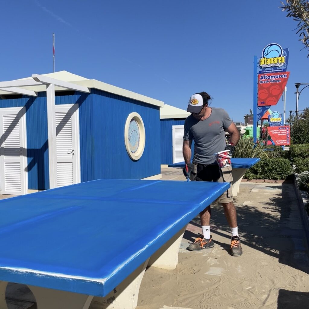 Perché all’Altamarea Beach Village, ci si dà già da fare da qualche giorno. Il bianco delle porte, dei vasi di fiori, del gazebo dell’animazione è più bianco, il blu dei muri e dei tavoli da ping pong è più blu.
